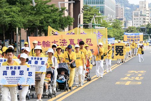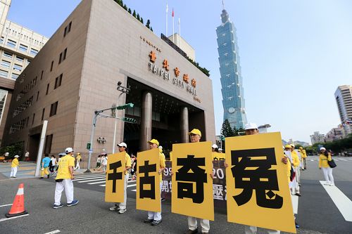 【明慧网二零一五年七月二十日】(明慧记者刘文新台湾台北采访报道)二零一五年七月十八日,台湾法轮功学员举办的“声援诉江大游行”,在大陆游客来台必到的一零一大楼旁信义广场举行。约两千多人下午三时起开始游行,沿途吸引很多台湾民众和大陆游客夹道观看,高喊:“加油!”支持起诉迫害法轮功的元凶江泽民。