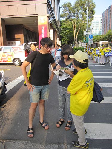 游行活动获得了沿路台北民众的支持,他们纷纷竖起大拇指对法轮功学员表示:“加油,我支持你们!”“支持诉江,谴责中共的暴行,这些罪恶必须被制止!”