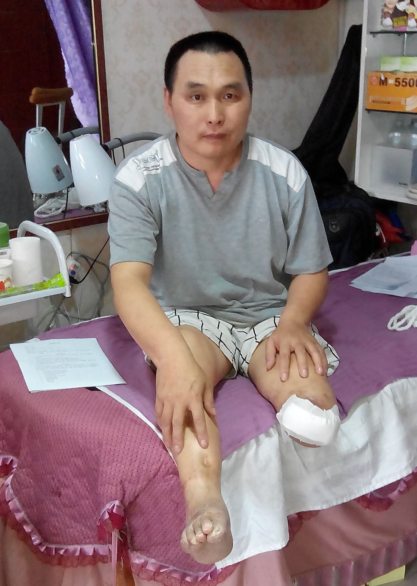 二零零四年十二月二十三日,我为了制止迫害,从锅炉房四楼顶跳了下来(编注:这种极端的做法不符合大法法理。但这完全是中共警察酷刑迫害造成的。)我在医院昏迷了好几天才醒过来,全身不能动,小腿部多处骨折,脚部根骨粉碎性骨折,下颌骨骨折,牙用钢丝穿上,头部骨裂一道缝,还有内脏无故失血,血补完就没,在四平中心医院住了一个来月,因腿部打石膏,里面化脓,高烧,就把我转到长春中日联医院骨科,在中日联医院住了三个月左右,在伤口没完全愈合、不符合出院的条件下,在我家属强烈反对的情况下,以转院为名,转到了四平中心医院,在中心医院住了一周就被转回监狱医院了。