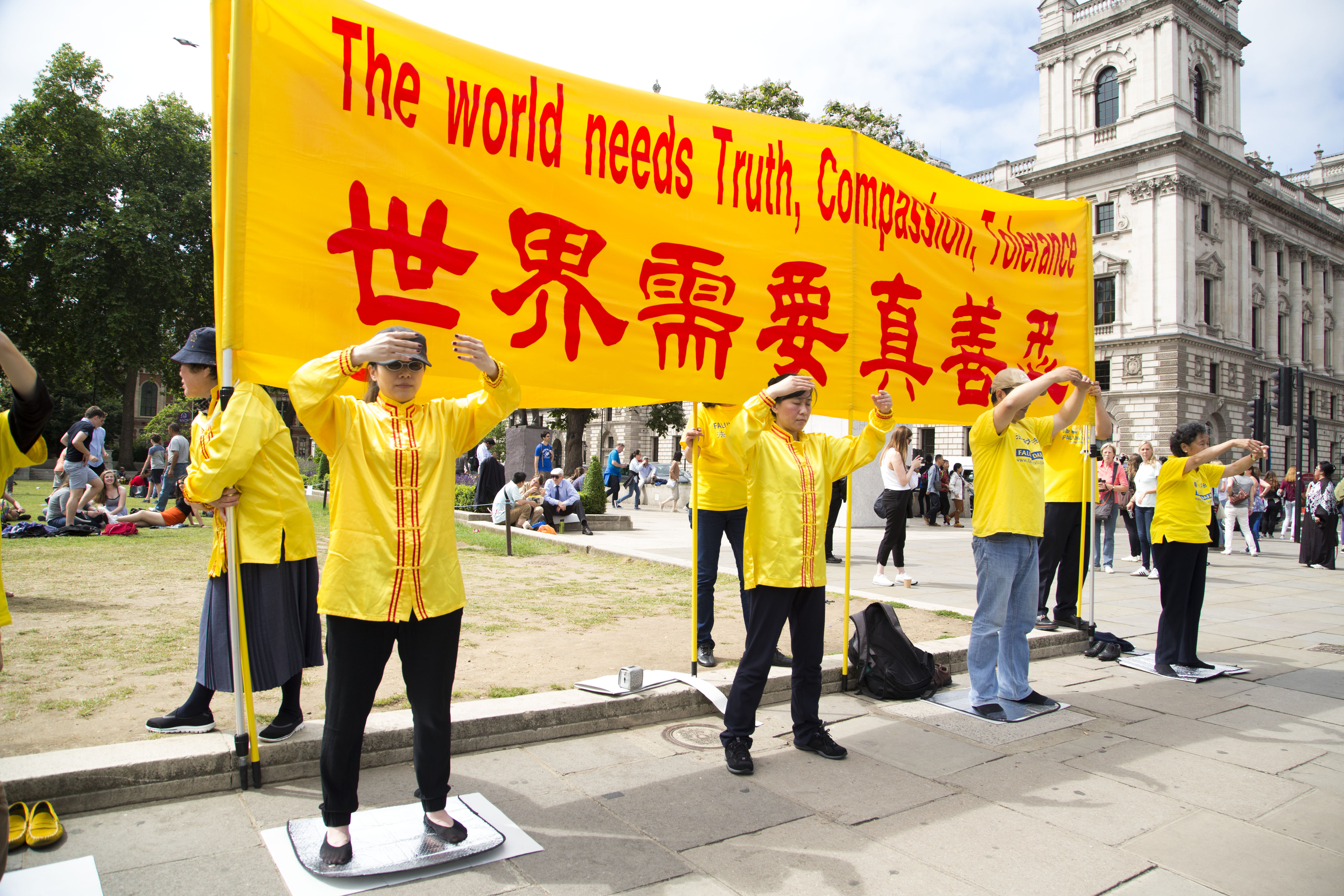 ![]() 图1:七月十五日,法轮功学员在英国会大厦前举办活动,传播真相。呼吁制止迫害。 |