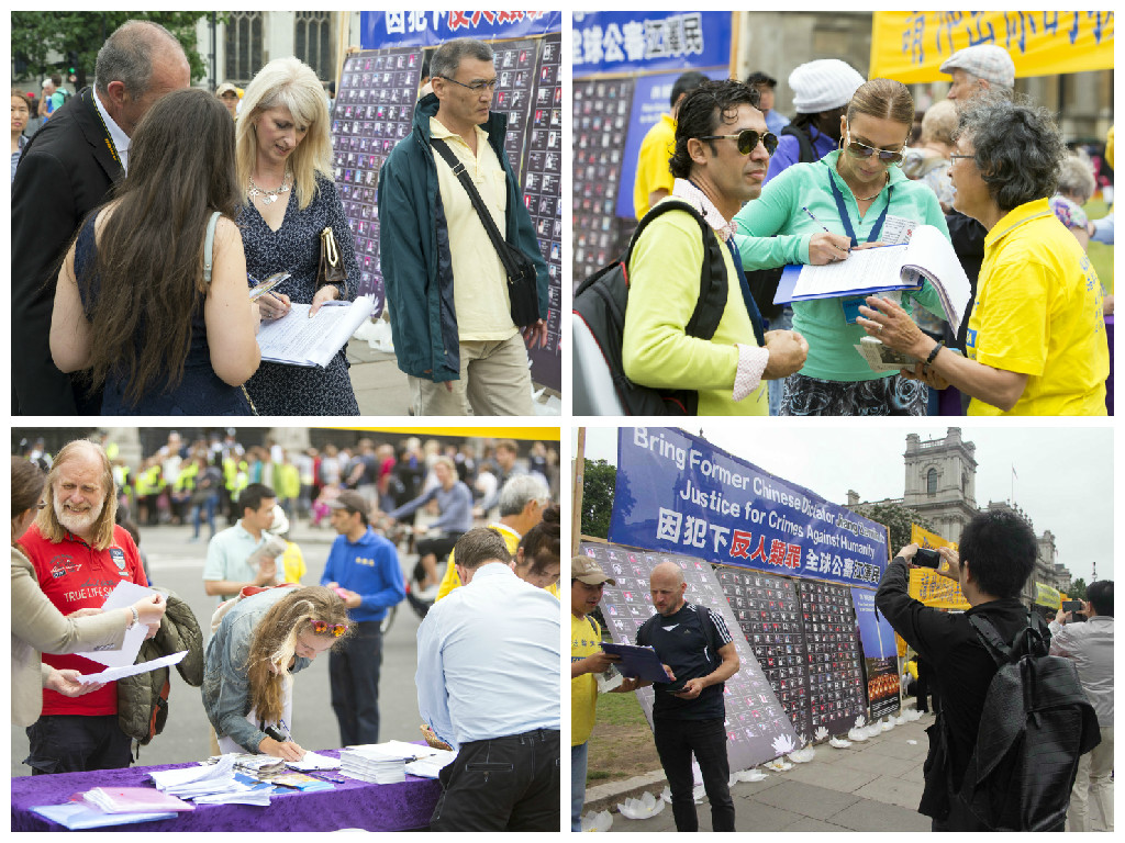 七月十八日是星期六,约百位法轮功学员在伦敦中使馆前集合,并从那里开始步行,经过热闹的伦敦市中心、中国城、最后来到首相府唐宁街氏号外,游行中有些法轮功学员们手捧着被迫害致死的法轮功学员的遗像,打着“声援三退超二亿,迎接中华新纪元”等横幅、沿途吸引了很多行人的关注。下午三时,向英国首相府递交了一份给首相卡梅伦的请愿书,连同写满英国社会民众签名的请愿表。