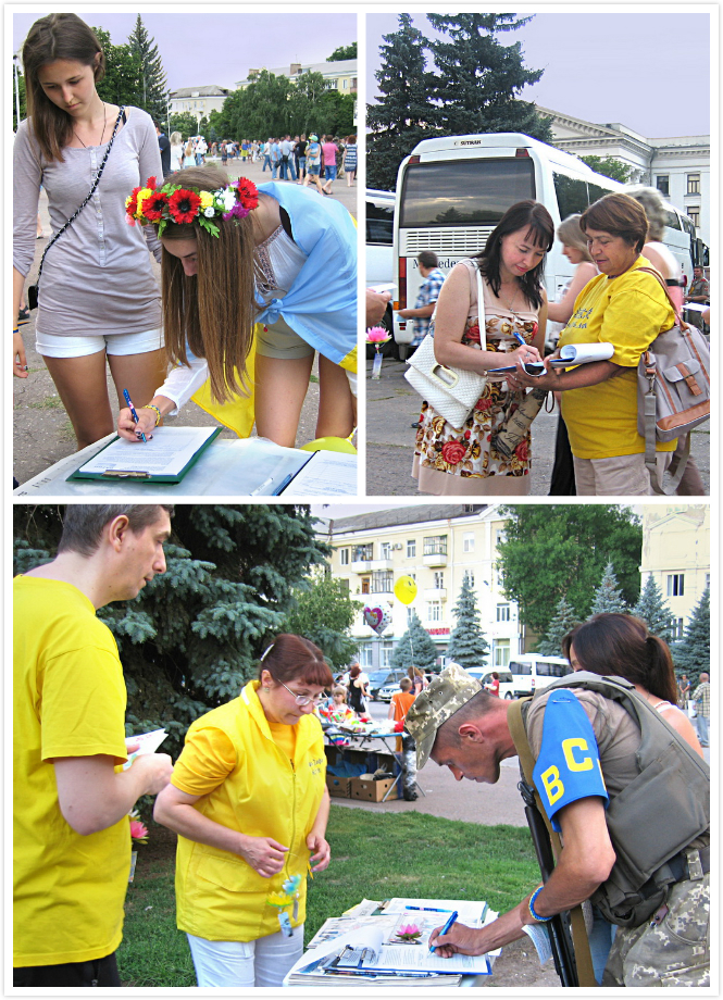 乌克兰克拉玛托尔斯科市,在七•二零到来之前,于当地的“解放日”节日上广传真相,揭露中共活摘法轮功学员器官的暴行,民众踊跃签名声援反迫害活动。