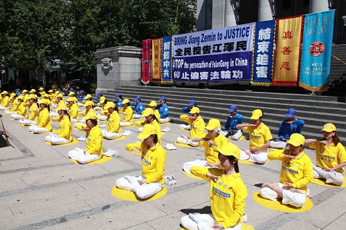 ![]() 温哥华法轮功学员和支持者在温哥华市中心艺术馆前举行纪念七二零反迫害十六周年集会 |