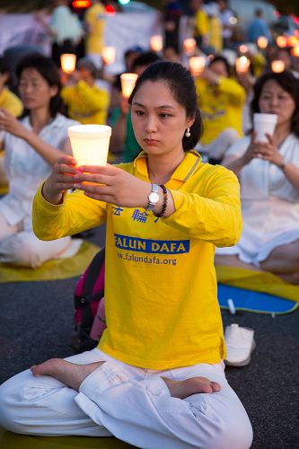 当天傍晚,法轮功学员纽约中领馆对面打出“停止迫害法轮功”、“全球起诉江泽民”、“法轮大法好”的横幅。数百名法轮功学员沿着河岸排列整齐,延绵上百米。他们先是演示法轮功的功法;随后在夜幕低垂时,学员们燃起点点烛光,默默悼念数百万在中共残酷的迫害中被夺去生命的同修。在学员静坐的最前面,一副写着:“停止迫害法轮功”的英文横幅,上面围绕了一圈、盛着点点烛光、象征法轮功学员圣洁、坚韧之精神的橘红色莲花座,场面肃穆而慈悲感人。
