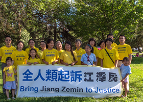 七月十九日,美国明州法轮功学员来到明尼阿波利斯市卡尔霍恩湖的湖边公园举办活动,声援中国民众起诉江泽民。