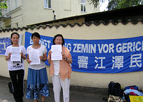 七月二十日,德国巴伐利亚法轮功学员们来到慕尼黑的中领馆前,声援诉江大潮。