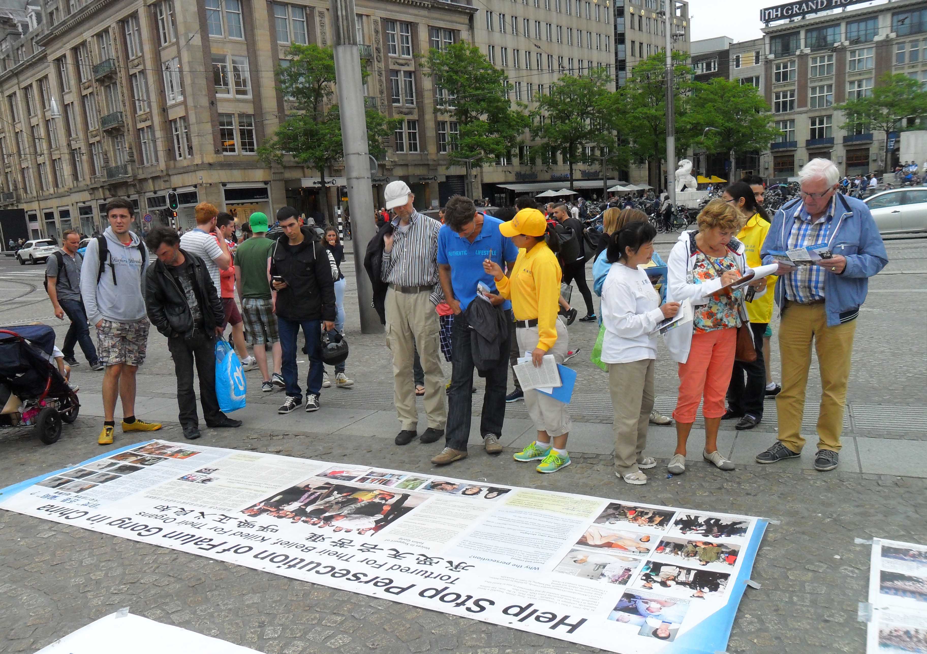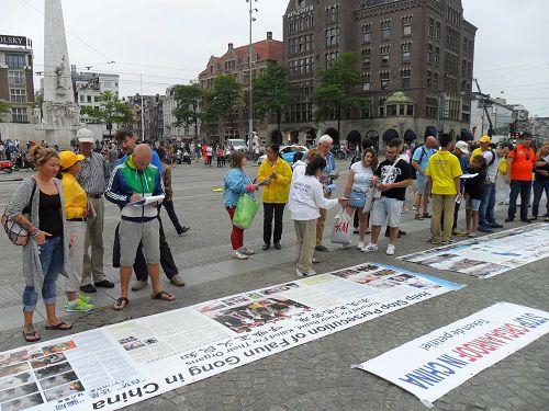 达姆广场是当地著名旅游点,每天都有大批各国游客前来游玩。许多游客认真阅读揭露中共酷刑迫害法轮功学员的真相展板。学员告诉他们,在迫害元凶前党魁江泽民的指挥下,中共如何残酷迫害法轮功学员的真相后,人们纷纷签名支持起诉江泽民。
