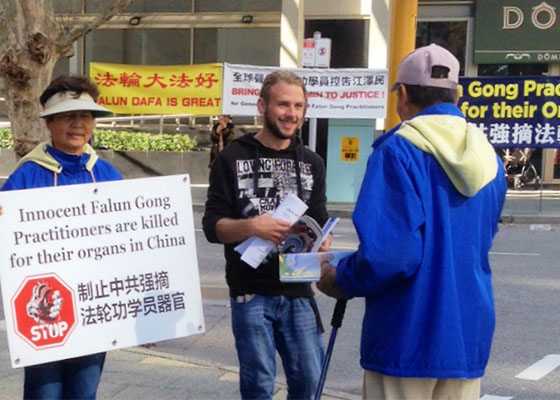 七月二十日,西澳法轮功学员来到珀斯中领馆外,向民众传播法轮功的真相,呼吁制止迫害。西澳州议员彼得•阿伯茨致信声援。