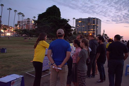很多游人被集会和烛光悼念的场面感动,纷纷了解真相,并在制止活摘法轮功学员器官的征签簿上签名。很多人表示,中共压抑信仰自由、迫害平和的法轮功修炼人,甚至活摘他们的器官牟取暴利,令人发指。到拉荷亚海滩遛弯的一对居住在圣地亚哥的中国老年夫妇说,我们都知道法轮功都是好人,共产党做的坏事太多了,我们都知道。