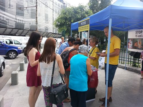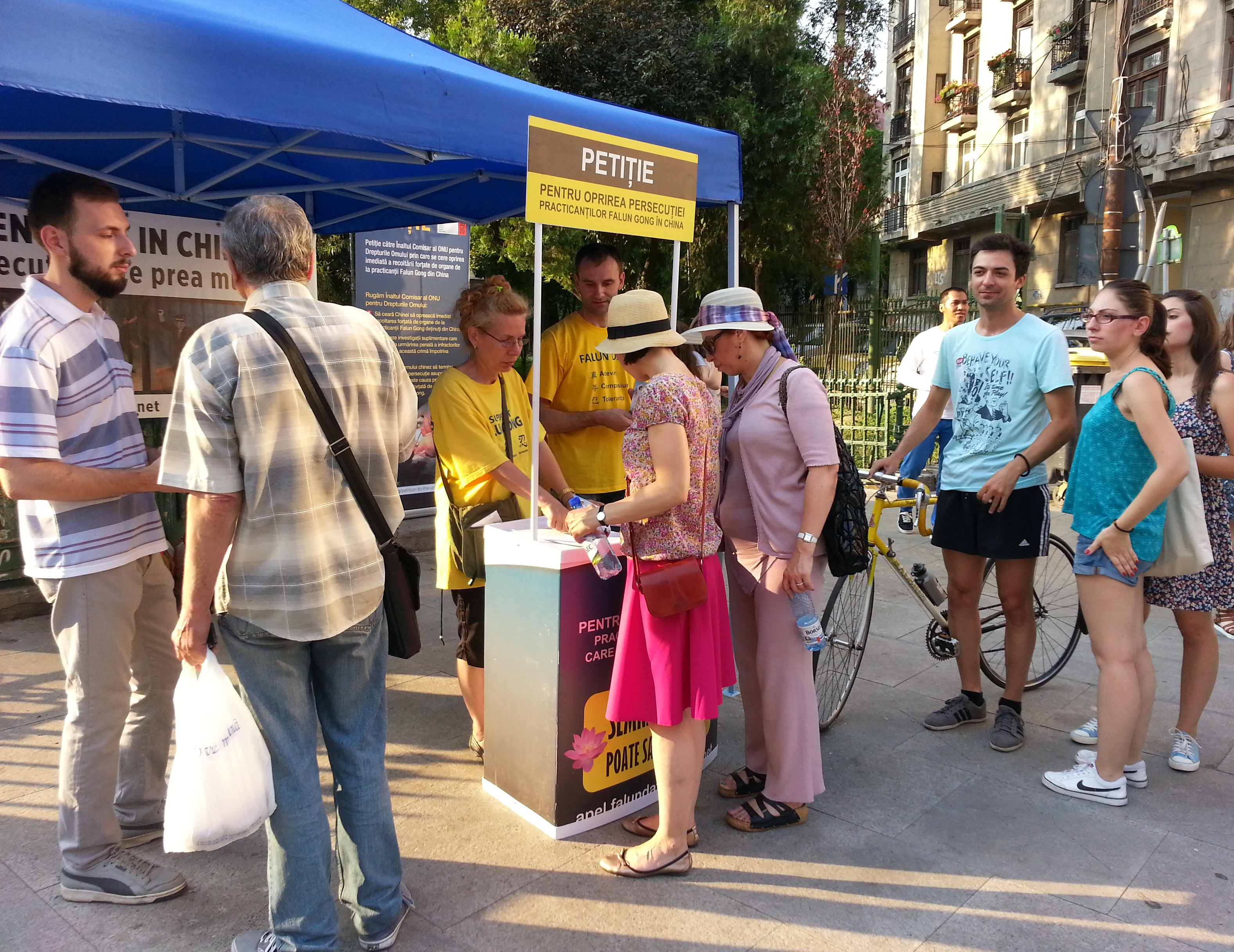 有不少签名的罗马尼亚人表示共产主义给人类带来的损失和灾难是不可估量的,因为他们也曾经深受其害。他们说中共如此迫害有信仰的善良民众,必然会遭到神的惩罚。大家拿了真相资料、光盘和美丽的折纸莲花,在签名之后离开的时候,大部分人都祝法轮功学员能够反迫害 成功。