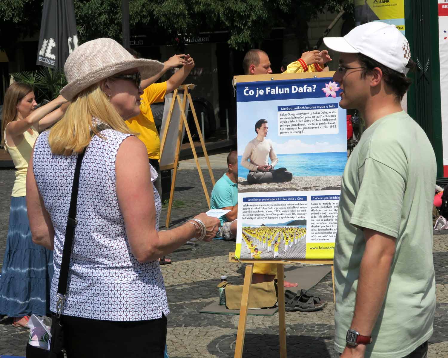 【明慧网二零一五年七月二十五日】中共从一九九九年七月二十日开始迫害法轮功,至今已经整整十六年了。斯洛伐克法轮功学员七月二十二日在首都布拉迪斯拉发(Bratislava)赫维兹多斯拉夫广场(Hviezdoslav)向人们讲述法轮功的真相。