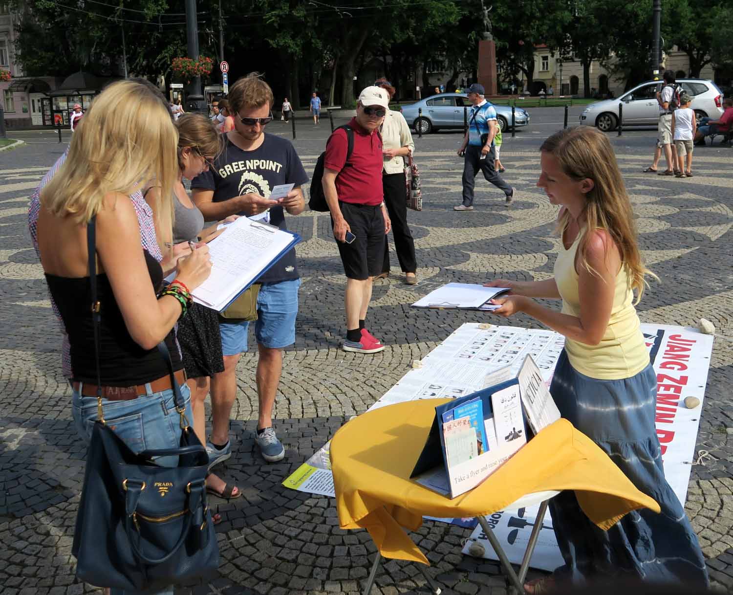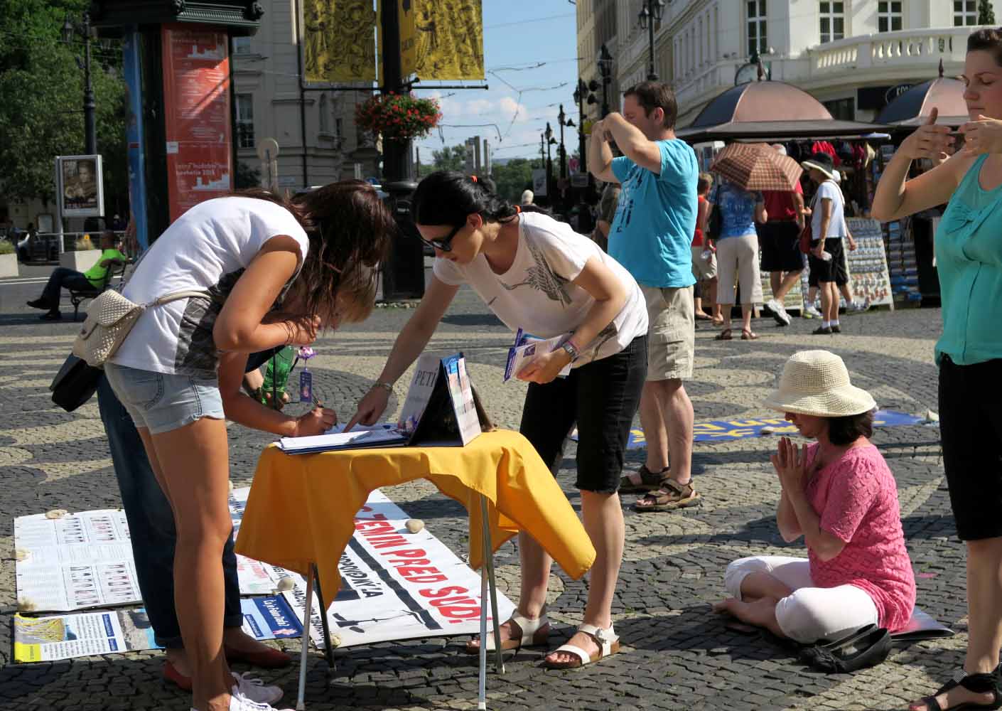 一位斯洛伐克女士询问能否给她中文的真相材料。她说:“我的同事是中国人。我要把中文资料带给他。”另一位女士在请愿信上签字后祝学员的活动成功。她说:“我支持法轮功的活动。”