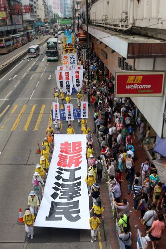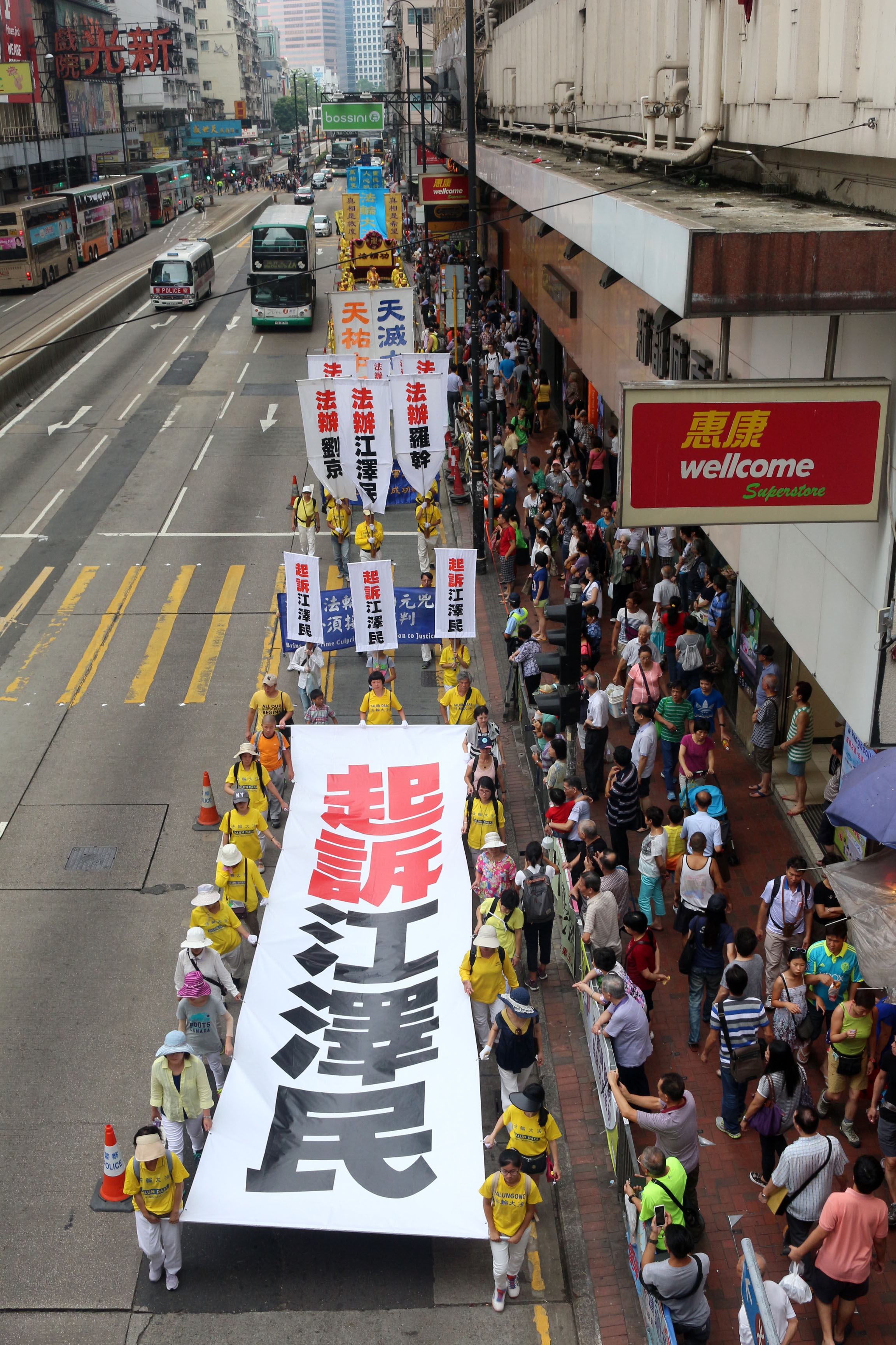 图2-3:法轮功学员于二零一五年七月十九日,游行港岛区英皇道、轩尼诗道,途经闹市铜锣湾、湾仔、中环,最终到西环中联办,历时约四小时。