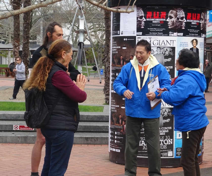 在汉密尔顿Middle Health医疗机构工作的泰瑞•福斯特(Terry Foster)对法轮功学员表示支持并在征签表上签名。他谈到,他的一个亲戚曾经在新西兰驻北京大使馆工作,因此他知道许多内幕,早就了解法轮功被迫害的程度十分惨烈。他说:“中共不希望人民知道真相,它要掩盖真相,并让人们按照它的意识形态生活。”他认为法轮功学员应该多出来告诉民众真相,因为“你们做的事情非常重要,充满着‘诚实’、‘和平’、‘慈爱’和‘感恩’”。他最后说:“你们应对自己感到骄傲,千万不要放弃,终有一天,你们会成功,全世界的人都会欢迎你们的到来。”