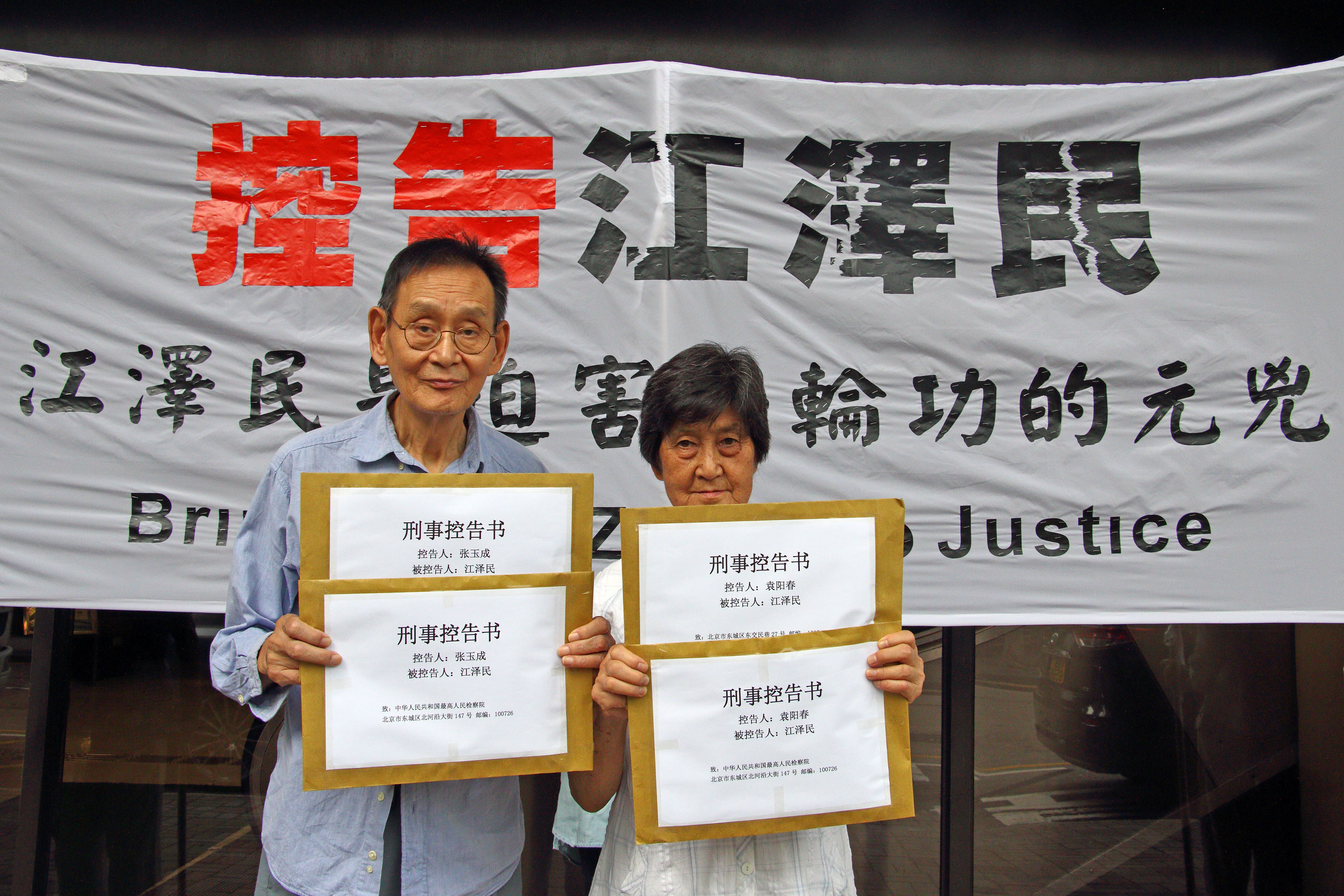 图4. 七十五岁的袁阳春(右)与丈夫张玉成(左)一起控告江泽民,要将他的罪行曝光于天下。