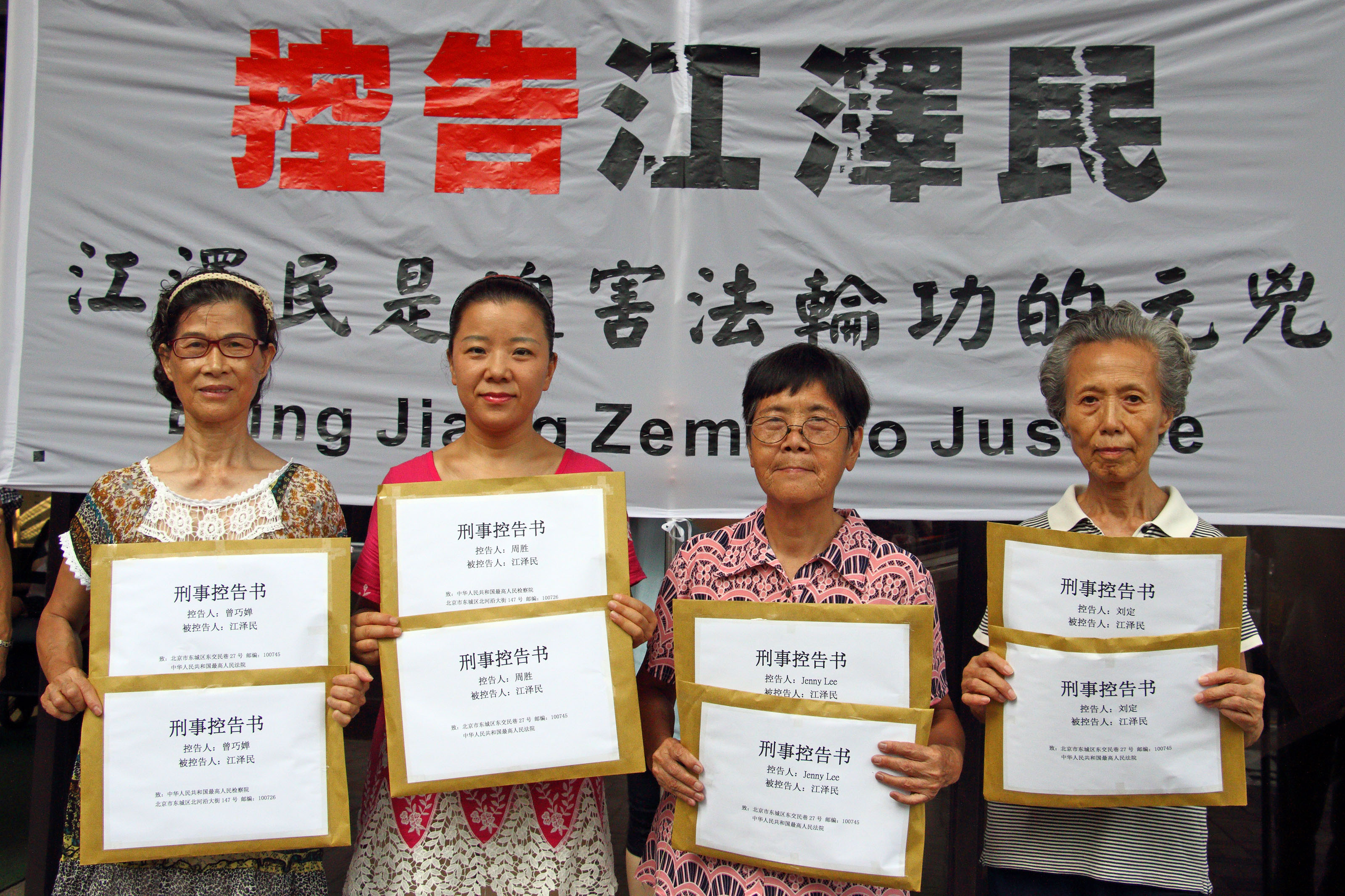 图5. 廖蕊兰(右二)控告江泽民反人类罪、酷刑罪及群体灭绝罪。