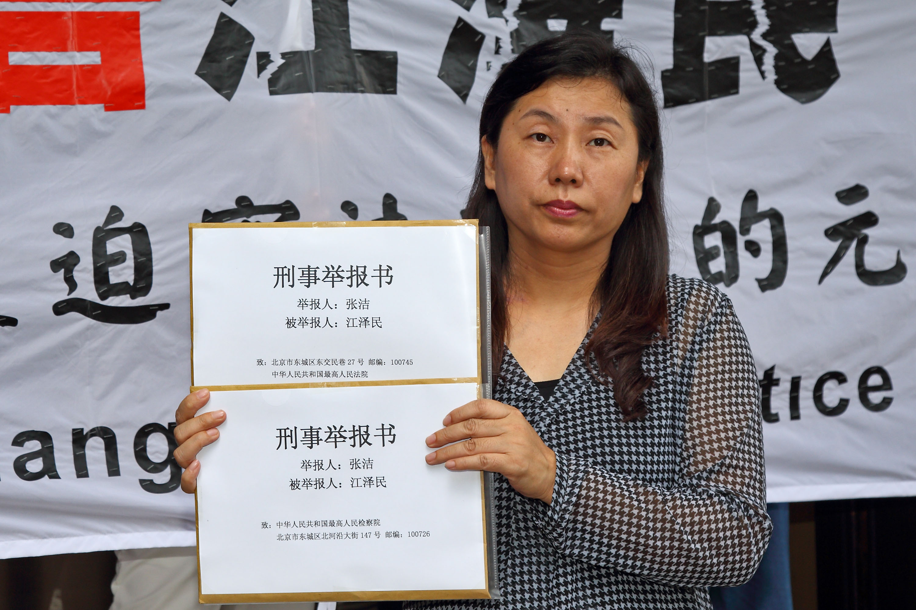 图2. 傅学英(左一)二度诉江,呼吁海内外华人认清江泽民对全人类的迫害。