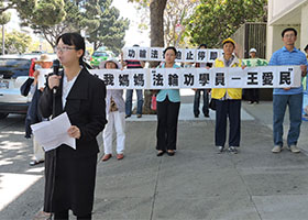 - RFA:旧金山法轮功学员要求中共释放被抓捕的亲人- 七月二十八日中午,美国旧金山法轮功学员在中领馆前举行新闻发布会,营救在中国被当局关押迫害的亲人。