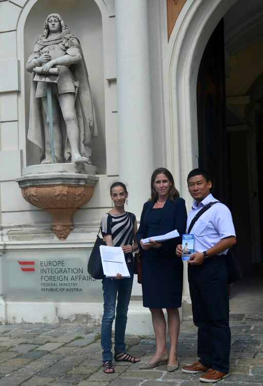 【明慧网二零一五年七月三十一日】二零一五年七月二十日,奥地利外交部人权专员Gerhard Doujak博士在奥地利外交部约见了奥地利国际人权组织“为受威胁人民协会”(GFBV)、法轮大法学会、和国际组织“医生反对强摘器官”(DAFOH)的代表,跟三位代表探讨了关于中共迫害法轮功学员的细节和最新情况。Doujak博士表示,非常关注中共对法轮功学员的迫害。