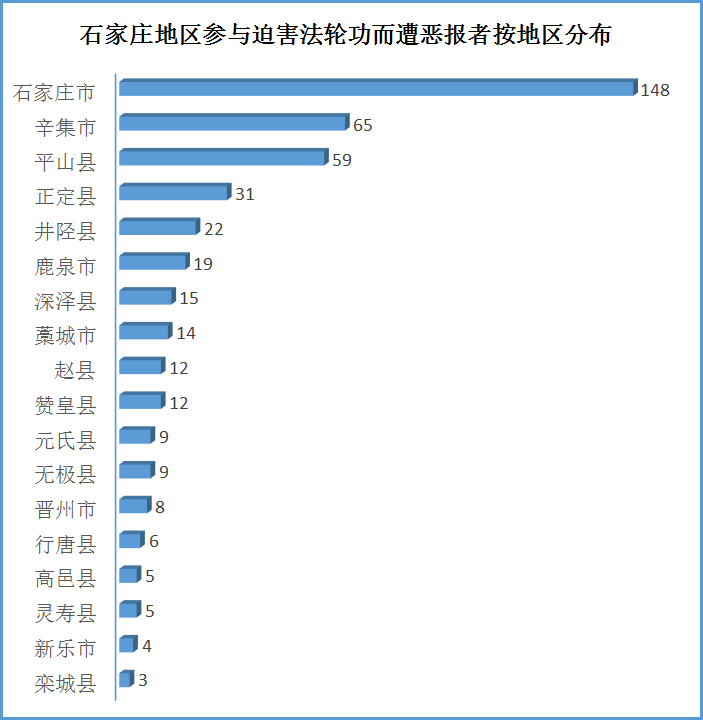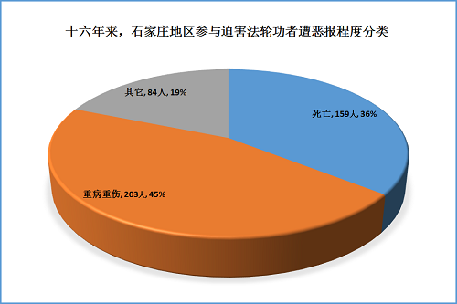 自一九九九年“七二零”至今,据明慧网不完全统计,石家庄地区因迫害法轮功而遭恶报的人数已有至少446人。其中当事人遭恶报的有346人,牵连到家属遭恶报的有100人。具体恶报涉及到石家庄地区十八个县市的公检法司部门、各级政府官员、企事业单位及个人。