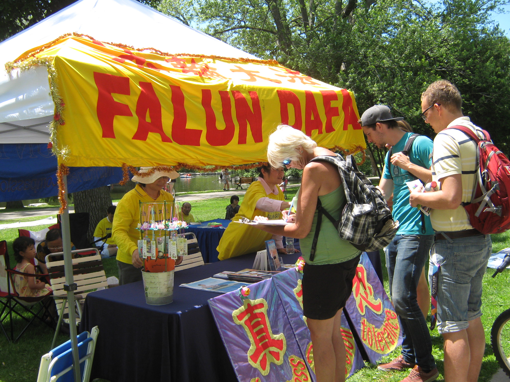 除了与其它团体面积相同的展位外,文化节组委会还安排了足够大的免费场地让法轮功学员教民众学炼功法。在蓝天白云与绿草碧水之间,法轮功学员真相展位帐篷上黄底红字的“法轮大法”横幅格外醒目。展位前后沿两条人行道旁各摆放了一套真相展板。了解到法轮功是性命双修的功法,却在中国遭到迫害,人们纷纷在反对中共活摘法轮功学员器官的征签表上签字,支持法轮功学员反迫害。来展位了解真相的中国同胞也一年比一年多,不仅拿取资料,还与法轮功学员互动交谈。
