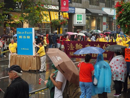 游行从城堡(Du Fort)大街开始,沿繁华的圣凯瑟琳(Ste-Catherine)大街一路东行至菲利普斯广场(Place Phillips)大街,天国乐团沿途一遍遍演奏《法轮大法好》、《法鼓法号震十方》、《法正乾坤》、《送宝》、和《永远的枫叶》等曲目。许多人随着演奏音乐的节奏舞动、欢呼。