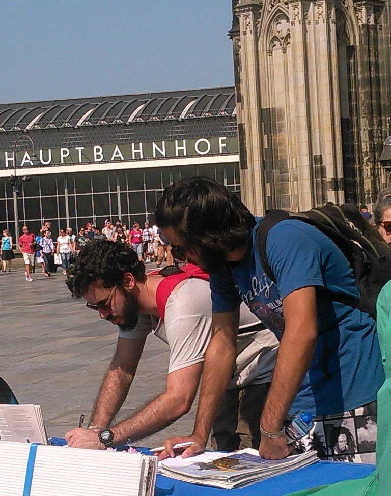 一对年青的中国夫妇在前一天和西人学员交谈过,对中共的做法很反感,之后拿了中文的真相报纸回去。第二天他们碰巧又经过科隆大教堂,然后在一个中国学员那儿爽快的做了三退(退出中共党、团、队,简称三退)。