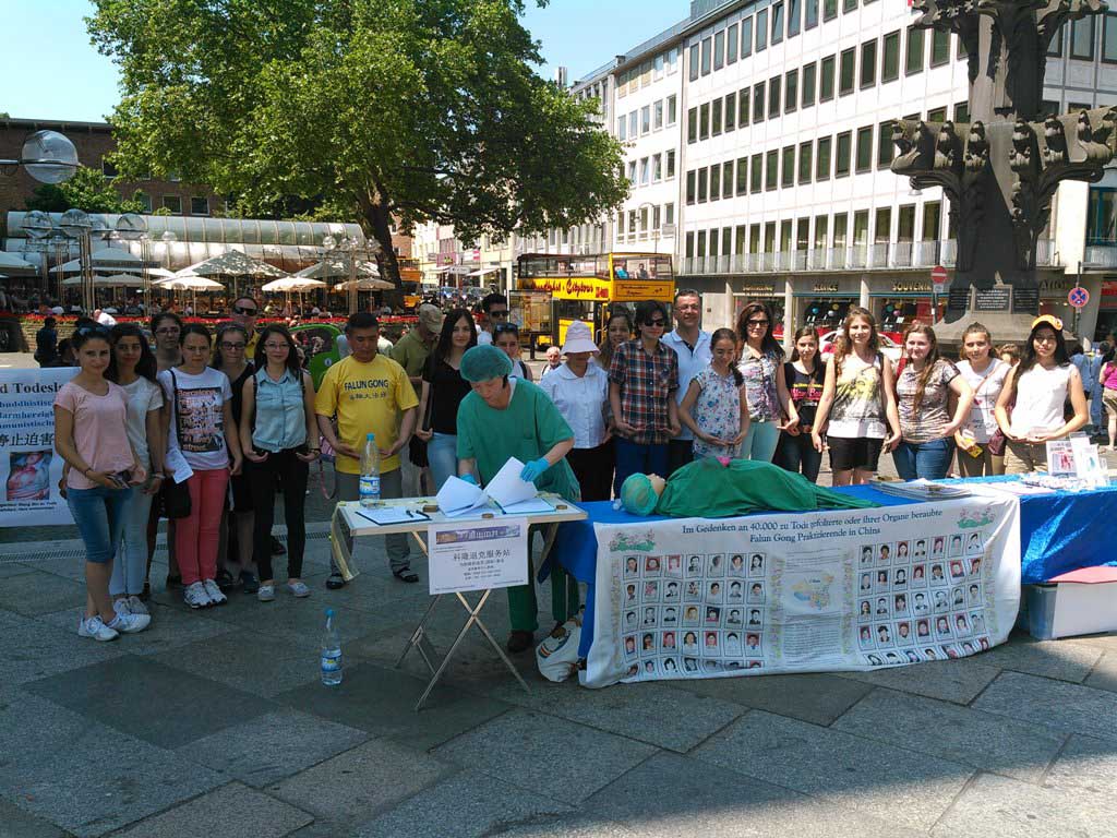 【明慧网二零一五年七月六日】德国的夏天向来凉爽,温度不是很高,可是二零一五年却持续高温超过三十五摄氏度,七月四日科隆最高达到三十七度, 但是在大教堂前游客依然络绎不绝。法轮功学员们也顶着烈日,照常将真相台搭起来,包括模拟演示台,揭露中共迫害法轮功,甚至活摘法轮功学员器官的暴行。