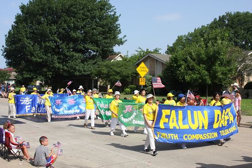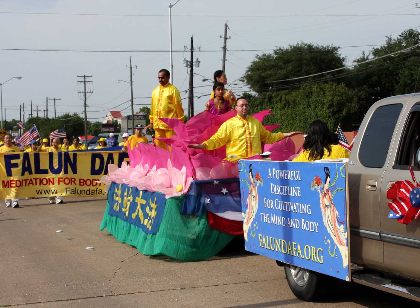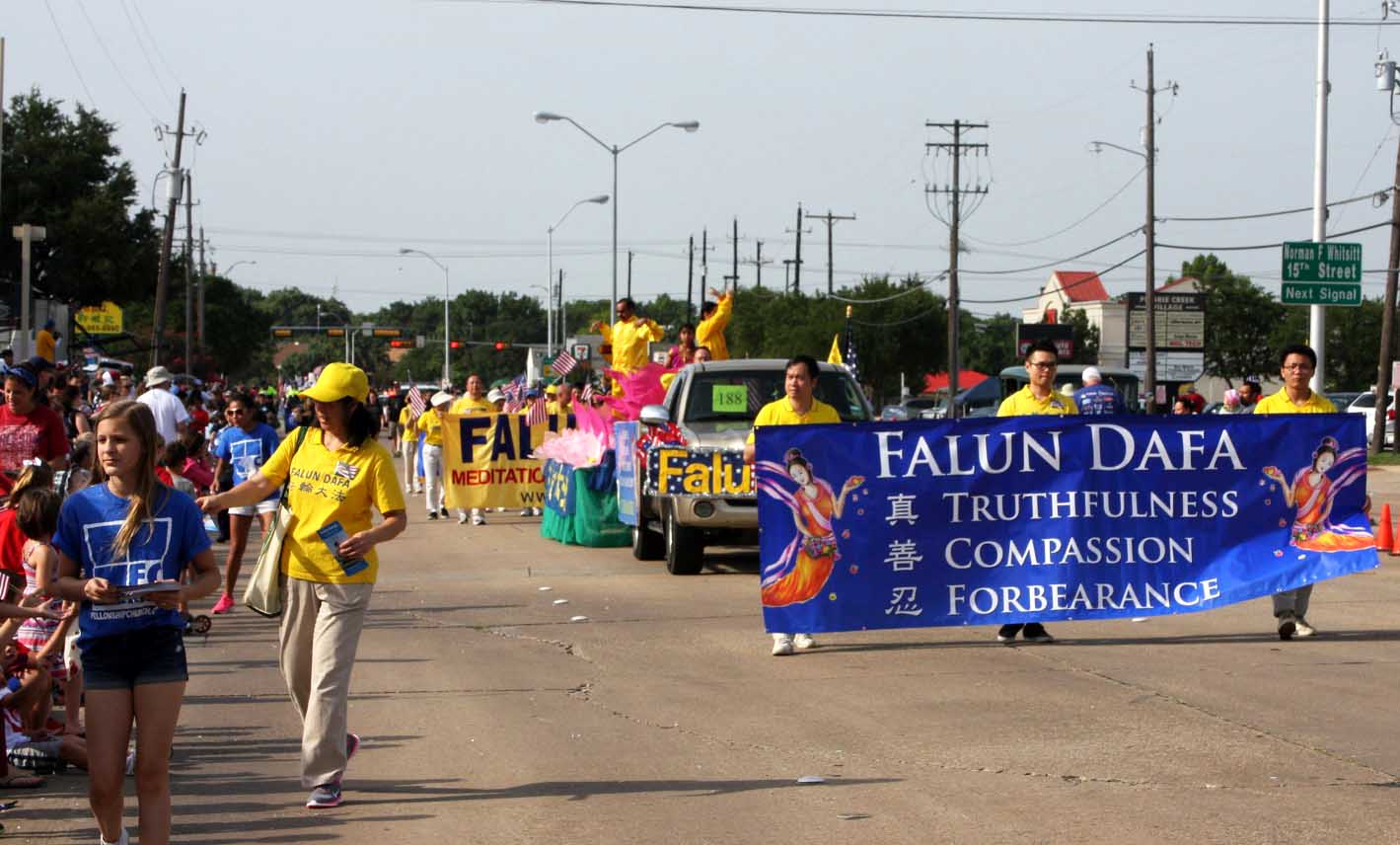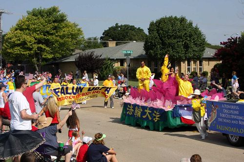 法轮功学员曾数次参加过布兰诺市的国庆游行。此次,学员除了在花车上演示优美的五套功法外,还向居民们展示了介绍法轮大法的各式横幅,播送祥和的歌曲音乐,并向沿途观众们发放法轮功真相资料,受到人们的热情欢迎。