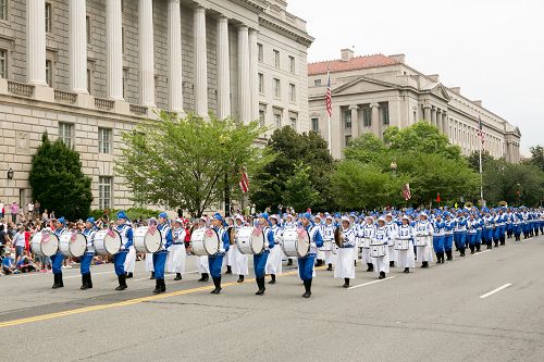 伴随着威武雄壮的鼓乐声,天国乐团踏上宪法大道。乐团成员身着中国传统服饰,步伐整齐,他们演奏的《法轮大法好》、《星条旗永不落》等乐曲,获得现场观众的阵阵喝彩。