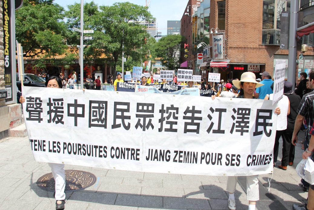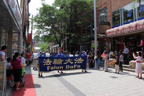 游行以天国乐团声势浩大的演奏开始,游行队伍穿过唐人街中心街道和蒙特利尔知名旅游景点老港的部分街道。时值周末,沿途观看的民众为数众多,不少路人欣喜地说:这演奏太好听了。在天国乐团的后面,法轮功学员举着“声援中国民众控告江泽民”等横幅,向公众传递这一重要信息。