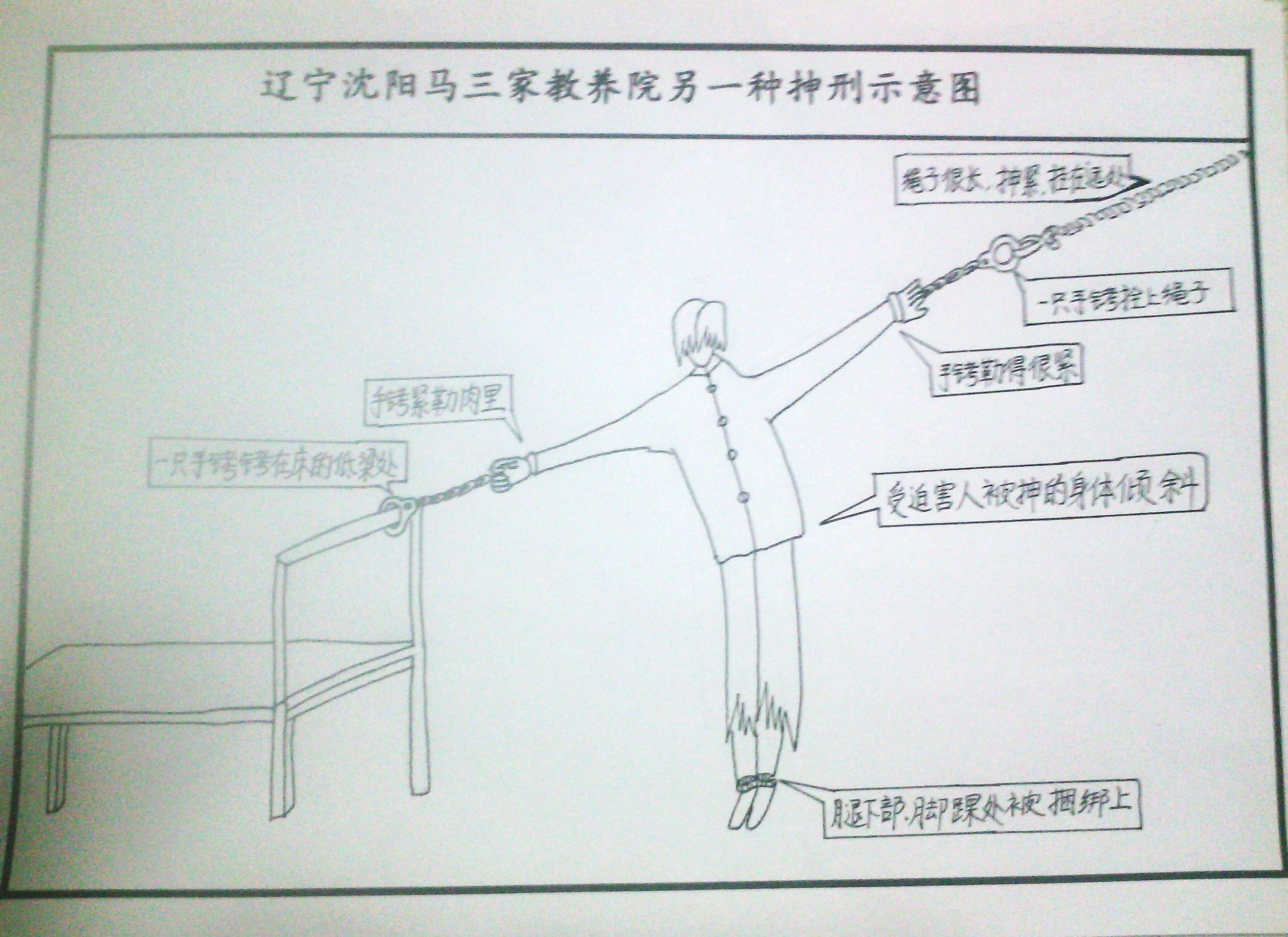 据我地法轮功学员回忆,当年在马三家教养院女队,还有另一种抻刑,这种抻刑对人的身体伤害很大。见图示。