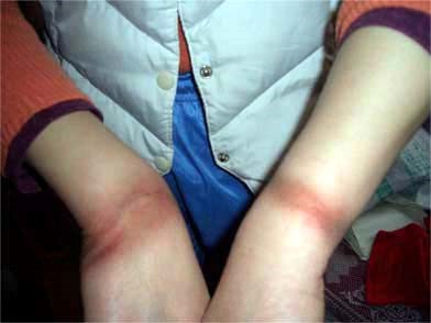 后来手铐开了,两天后,管教看我没反映,发现我没戴背铐,就又来给我戴上,而且戴的非常紧,把手腕压进一个大坑,都流血了。我承受着无尽的痛苦,真是语言难以描述,生活不能自理,法轮功学员们帮我洗脸、喂饭,照顾我两天一宿。同屋的常人都吓哭了,为我心疼着急。我当时的心情真没想到我还能活着,我就告诉文化高的杨丽:“万一我有什么不测,你出去后一定要揭露邪恶,给它曝光。”我戴背铐两天一宿,分分秒秒我都在巨大的痛苦中煎熬,我痛得昏迷过去,全屋的法轮功学员都大声喊,喊来管教来给我打开背铐和脚镣。来了一个狱医说:“这样的刑罚可不行呀。”姓邵的男管教以为我是装的,竟毫无人性地穿着皮鞋踢我两脚。