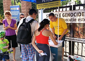 - 罗马尼亚民众支持法轮功反迫害(图)- 七月五日,在罗马尼亚首都布加勒斯特市,当地法轮功学员们举办活动,向游客们介绍法轮功,并揭露中共十六年来对法轮功的残酷迫害。