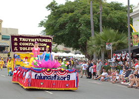 - 参加圣地亚哥独立日游行 法轮功花车获奖(图)- 圣地亚哥法轮功学员应邀参加了当地规模最大的科罗纳多岛的独立日游行。今年,法轮功学员精心装饰的花车获得二等奖。