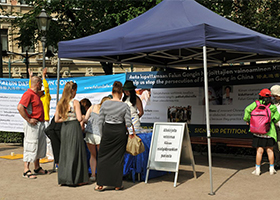 - 在芬兰海滨公园讲真相征签(图)- 七月四日,芬兰法轮功学员如往常一样,周末在游客行人密集的海滨公园讲真相征签,制止中共活摘器官的恶行。