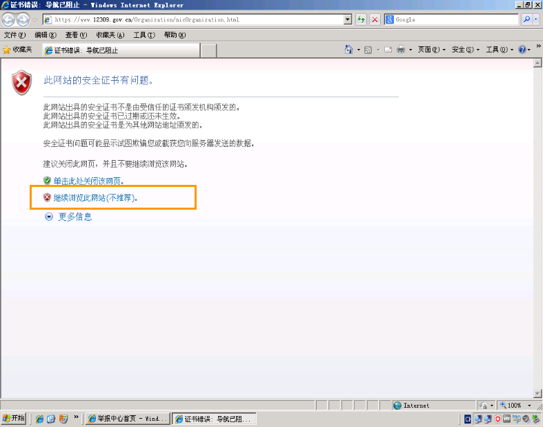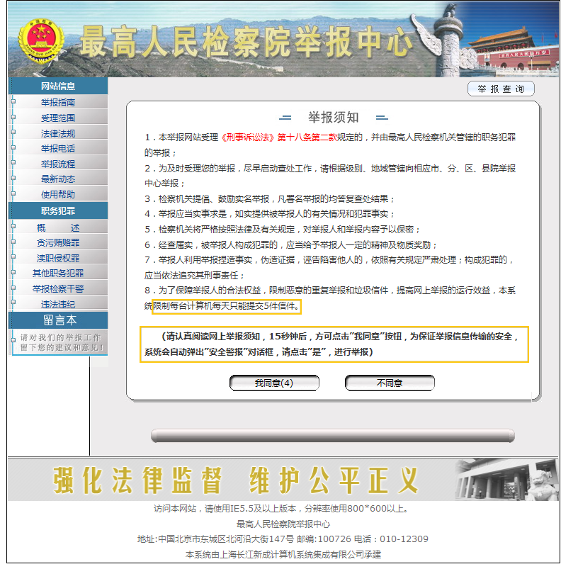 2、输入网址 https://www.12309.gov.cn/nicDefault.html 進入最高检察院网上举报中心(见图2),注意黄色边框区域文字:限制每台计算机每天只能最多投递5次;还有要等15秒以后才能点击“确定”,然后可能会出现警告提示(见图3),点击继续就可以了。