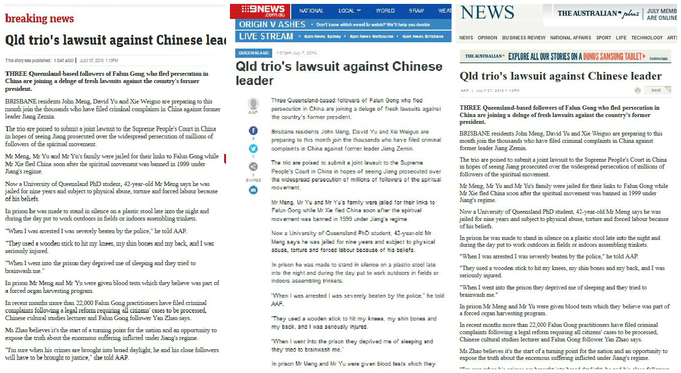 澳新社(AAP)旗下记者对三位原清华学子控告前中共头目江泽民进行了报道,此文随后被全澳十几家主流媒体转载,引起广大民众的关注。