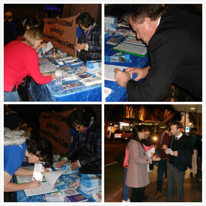 新闻发布会后,学员们又到中领馆附近向过往行人讲真相,揭露迫害,特别是活摘法轮功学员器官的罪行。不少行人驻足了解真相,并在征签簿上签名。