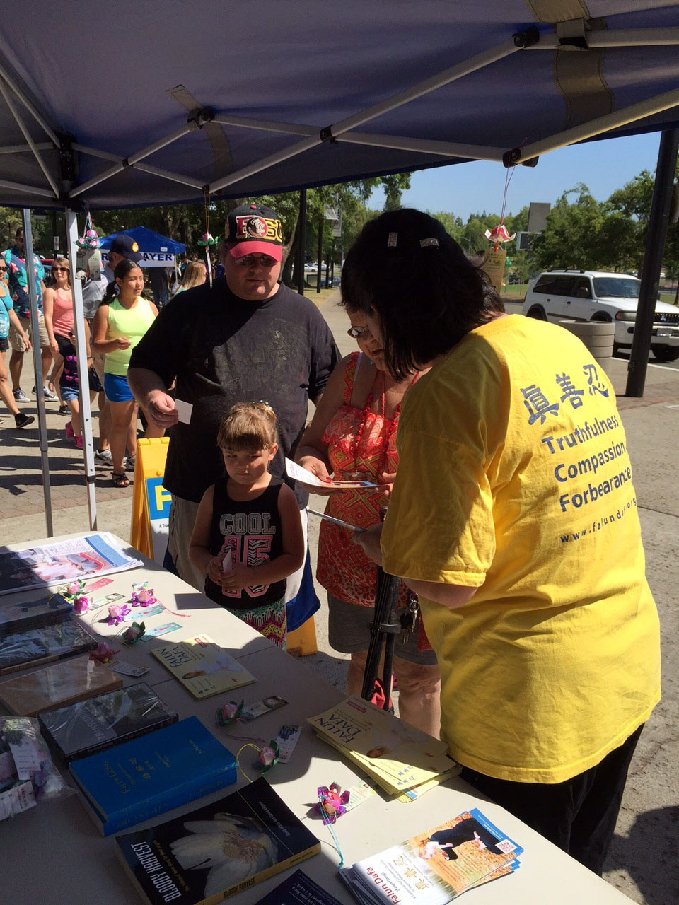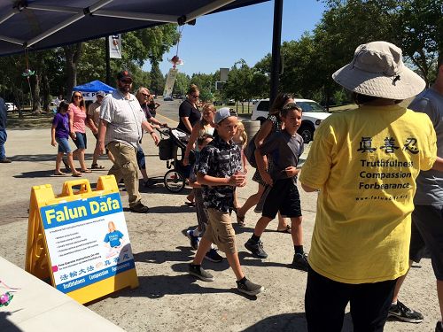 一位年轻华人推着婴儿车来到博览会正门,远远地看到法轮功展台,就快步走过来拿了资料道了谢离开。因为正值暑假期间,有好些从大陆或台湾来短期学习的中小学生,他们都表示有兴趣了解真相,拿了不少资料。一位戴眼镜的十一、二岁男孩,正要拿真相资料时,他的美国监护人立刻问他,是否确定要拿资料?是否知道他拿的是什么?男孩郑重地对大家说:“我知道法轮功,但不了解,我想要知道更多!”在拿了足够的真相中英文资料后,学员问他,你还想看《九评共产党》吗?他又郑重地一点头:“是的”。最后,跟他一起的另外两个大陆男孩也都拿了真相资料后满意地离开。