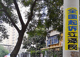 - 东北、河北、山东、甘肃、云南等地的“诉江”标语- 自五月起,中国大陆的法轮功学员和他们的家属纷纷投递诉状,控告迫害法轮功的元凶江泽民。诉江大潮的信息在在中国大陆广泛传播。