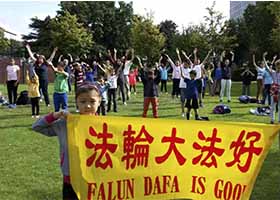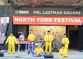 - 多伦多法轮功学员北约克节上受欢迎(图)- 多伦多法轮功学员应邀参加了在多伦多市梅尔拉斯特曼广场举办的北约克节。他们表演了舞蹈、舞狮,并演示了法轮功功法,受到欢迎。