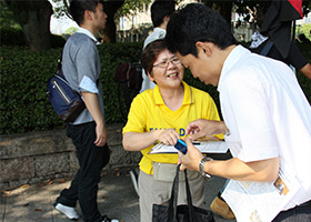 - 日本广岛法轮功学员征签声援诉江大潮(图)- 八月六日是日本广岛原爆七十周年纪念日。当地法轮功学员在此向世人传播法轮功真相,并开展征签声援诉江大潮活动。