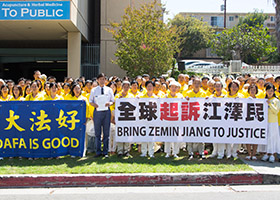- 美西南法轮大法学会声援诉江大潮(图)- 八月八日上午,美西南法轮大法学会在洛杉矶中领馆前召开新闻发布会,已有三百多位人士联署举报中共前头目江泽民。