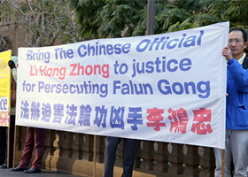 - 迫害法轮功 湖北省委书记李鸿忠在悉尼遇抗议(图)- 八月六日上午,法轮功学员在悉尼市政厅前面的乔治街(George St)上打出“法办迫害法轮功凶手李鸿忠”等反迫害横幅。
