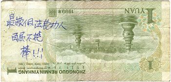〖大陆来稿〗这是我在山东省威海收到的一元钱,钱上写着“最敬佩法轮功人,百屈不挠,棒!!!”看到这个对我有很大的鼓舞,越来越多的世人明白了真相。