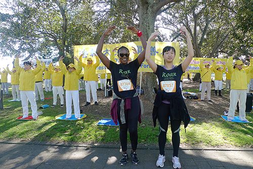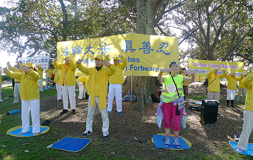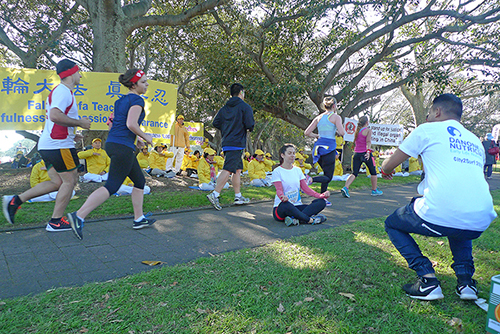 ![]() 图1-2:悉尼部分法轮功学员在悉尼举办的一年一度的马拉松赛跑的必经之路的道路旁演示法轮功功法,传播法轮功的美好。 |