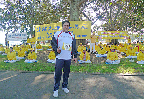 ![]() 图7:这位马拉松参赛者竖起大拇指,对法轮功学员表示赞美。 |