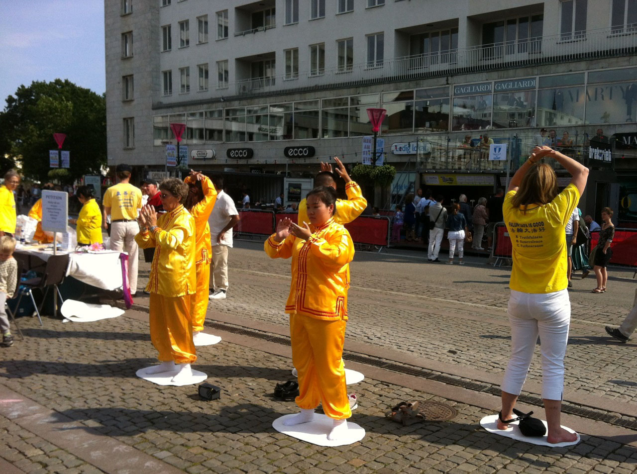 二零一五年八月十六日,瑞典法轮大法协会受马尔默文化节主办方邀请参加了文化节,并受邀在文化节舞台上演示功法。法轮功学员们在文化节上设立了真相展位,展示大法的美好和传播大法真相,同时揭露在中国正在发生的对法轮功学员的残酷迫害及活体摘取器官的罪恶。很多民众主动地走到展位前了解法轮功真相,并在反活摘征签表上签名。
