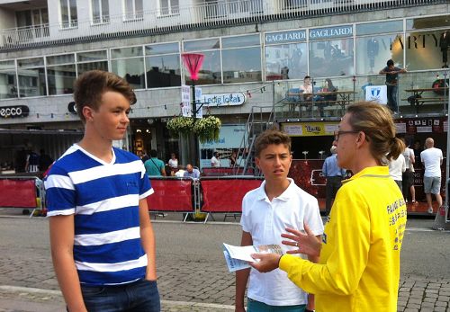 还有一对来自中国东北的父女,女孩在瑞典留学。这对父女在展位前驻足观看了很久,女孩对学员说她想学炼法轮功,并询问在哪里可以参加集体炼功。女孩的父亲表示支持,说在中国不敢炼,在这里很自由。